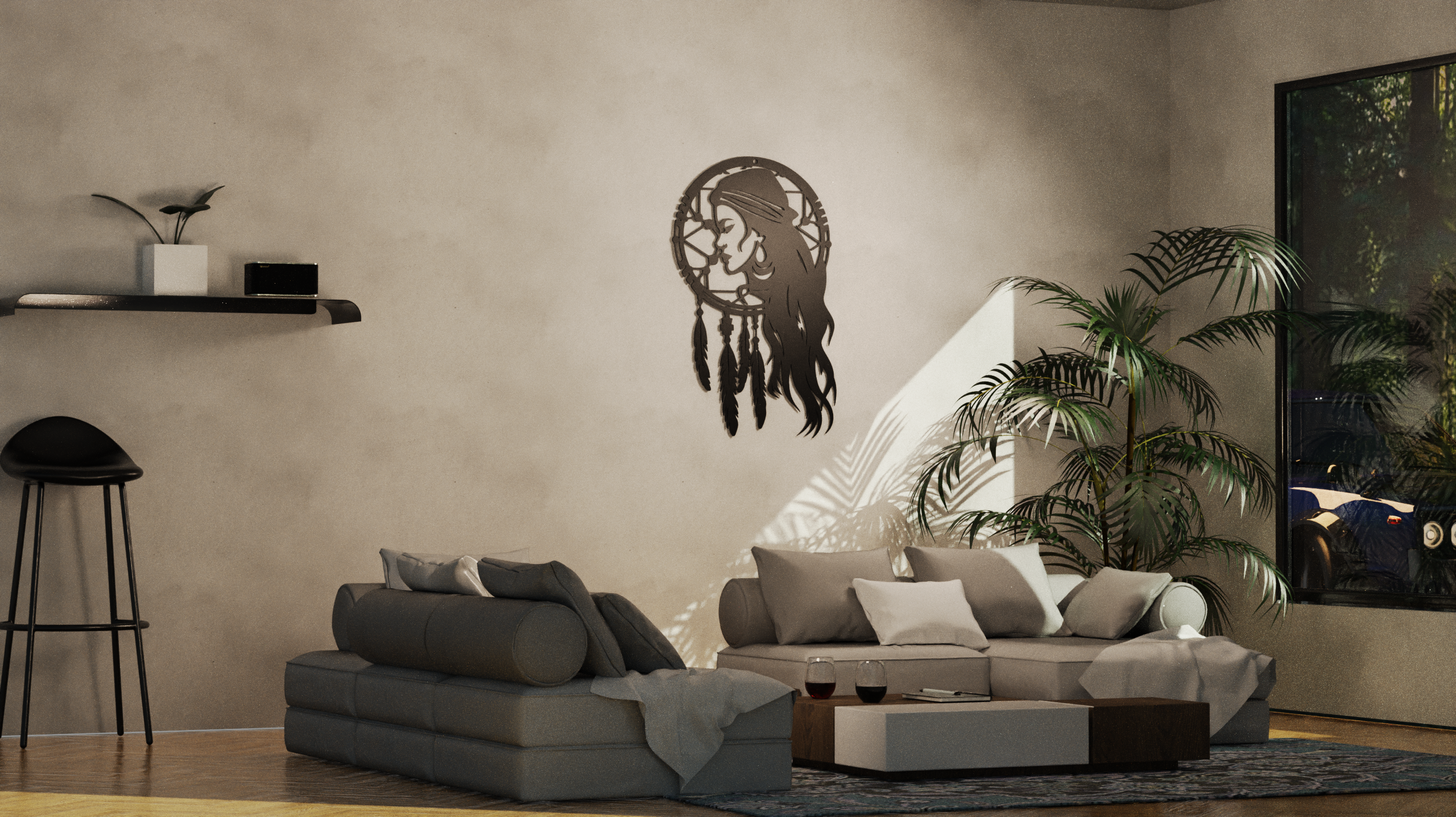 תמונת מתכת מאלומיניום איכותי קל משקל של לוכד חלומות עם דמות אישה בסגנון בוהו שבטי-אומנותי, בעבודת חיתוך לייזר מדויקת עם פרטים חדים ומוקפדים. הקווים הנקיים והעיצוב המודרני משתלבים בקלות בחללים שונים - סלון, חדר שינה או משרד. ניתן להוסיף תאורת LED אחורית ליצירת עומק ואווירה מיוחדת.