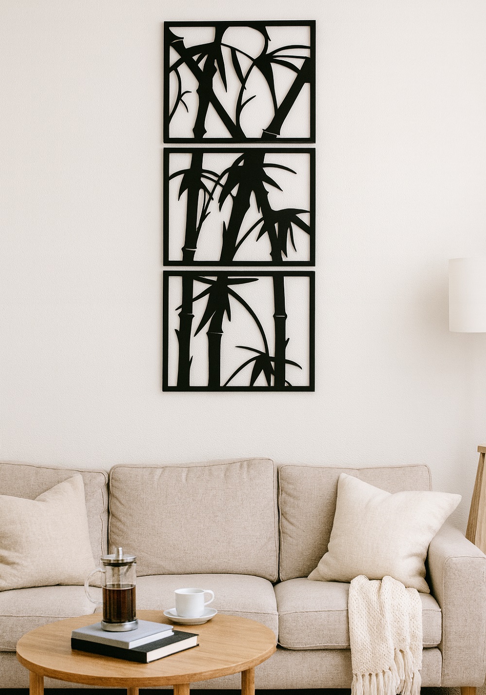 פריט עיצוב ייחודי מאלומיניום איכותי קל משקל בחיתוך לייזר מדויק, המציג דגם מרשים בשלושה חלקים של קני במבוק עם עלים. העיצוב הנקי והאלגנטי מתאים לחללים מודרניים וקלאסיים, ומשתלב בסלון, חדר עבודה או מבואה. ניתן לשדרג עם תאורת LED אחורית ליצירת מראה מרשים במיוחד.