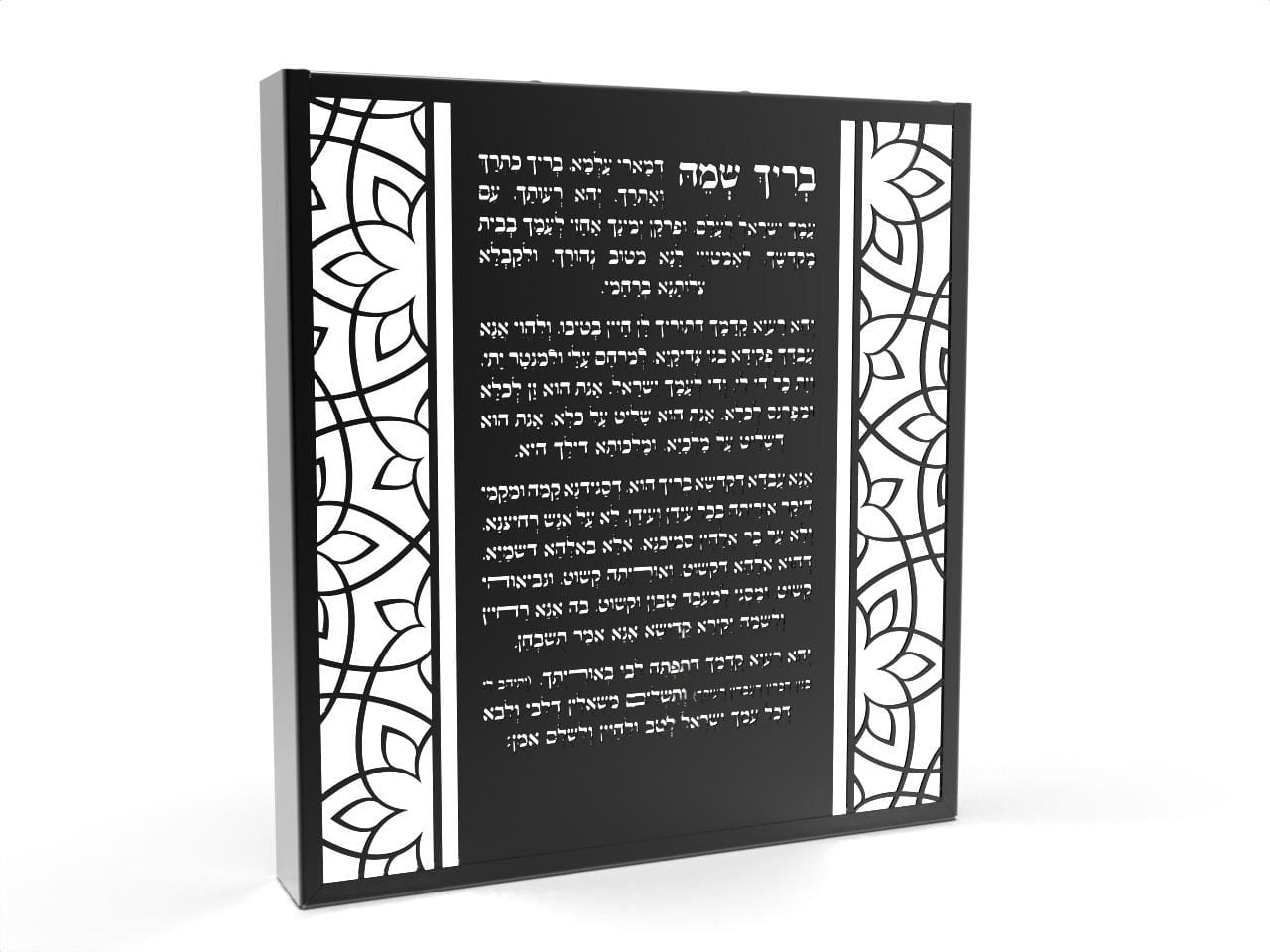ברכת "בריך שמיה" בעיצוב חיתוך בלייזר, מיוצרת מאלומיניום איכותי בצבע בתנור, ומצוידת בתאורת לד שתורמת לאווירה רוחנית ומרשימה בבית הכנסת. המידות הן 71.23 ס"מ רוחב, 69.72 ס"מ גובה ו-6 ס"מ עומק. ניתן להוסיף הקדשה אישית לעילוי נשמת קרוביך בעלות נוספת של 350 ש"ח. המוצר מהווה תוספת רוחנית ויוקרתית לכל מקום תפילה.