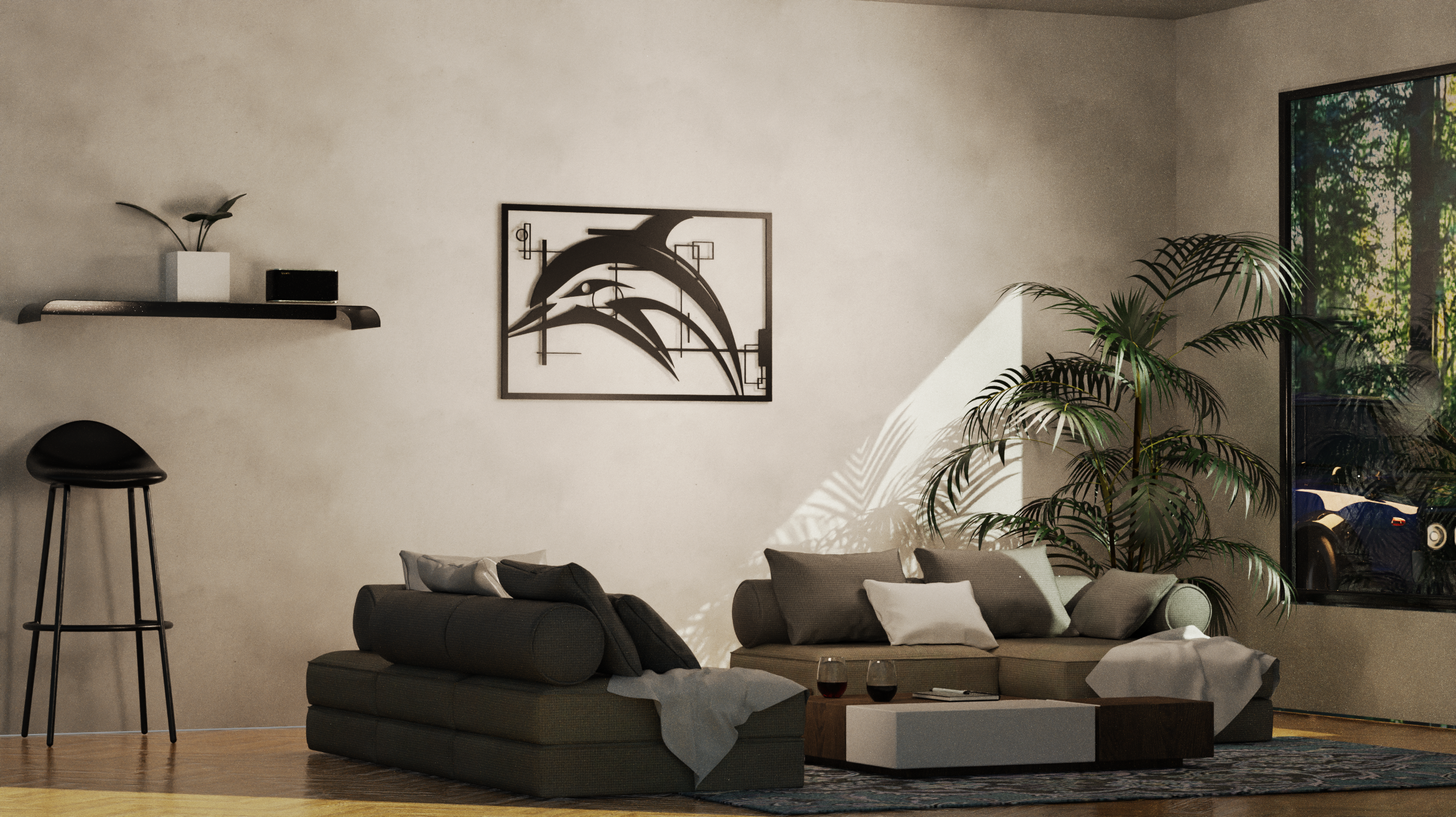 תמונת מתכת מאלומיניום איכותי קל משקל בעיצוב דולפין במסגרת עם אלמנטים גיאומטריים, בעבודת חיתוך לייזר מדויקת עם פרטים חדים ומוקפדים. הקווים הנקיים והעיצוב המודרני משתלבים בקלות בחללים שונים - סלון, חדר שינה או משרד. ניתן להוסיף תאורת LED אחורית ליצירת עומק ואווירה מיוחדת.