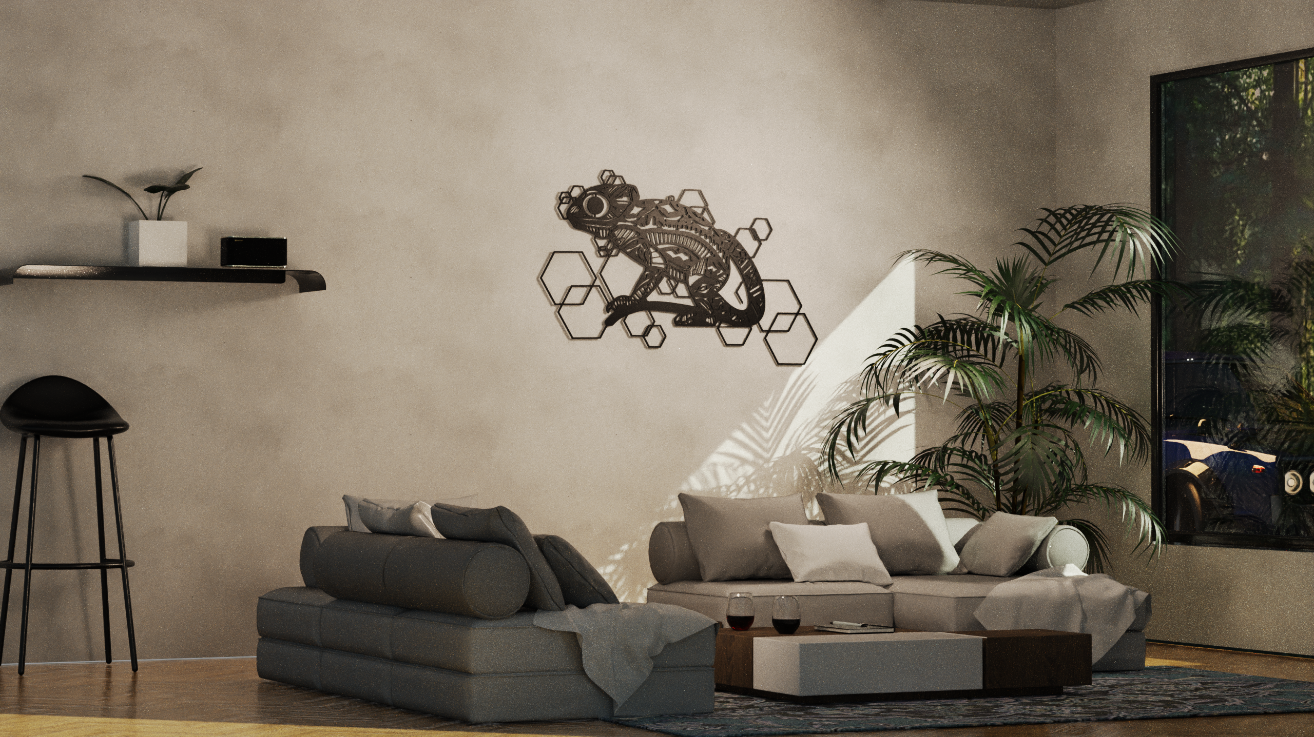 תמונת מתכת מאלומיניום איכותי קל משקל בעיצוב זיקית מרשימה עם אלמנטים גיאומטריים, בעבודת חיתוך לייזר מדויקת עם פרטים חדים ומוקפדים. הקווים הנקיים והעיצוב המודרני משתלבים בקלות בחללים שונים - סלון, חדר שינה או משרד. ניתן להוסיף תאורת LED אחורית ליצירת עומק ואווירה מיוחדת.