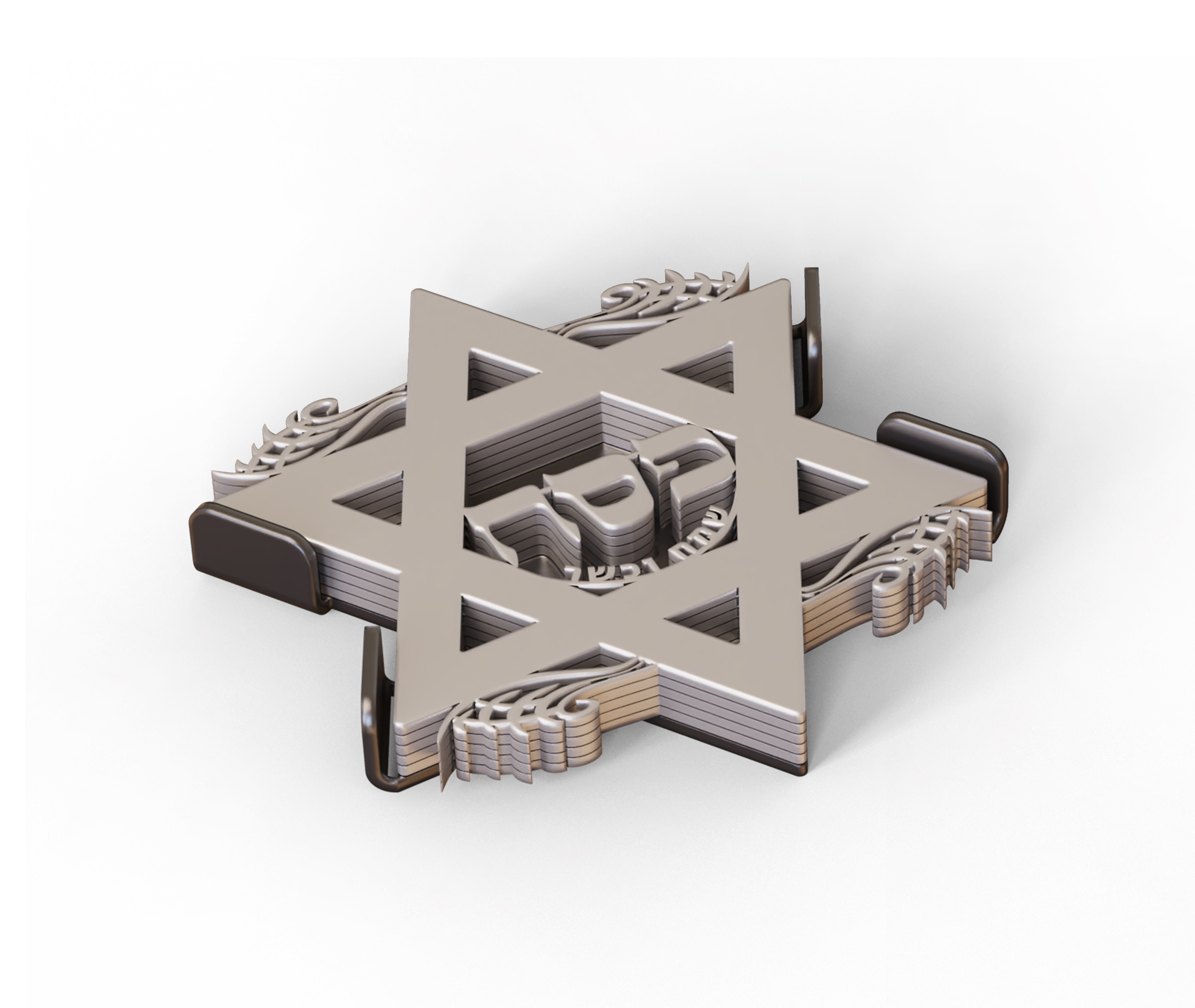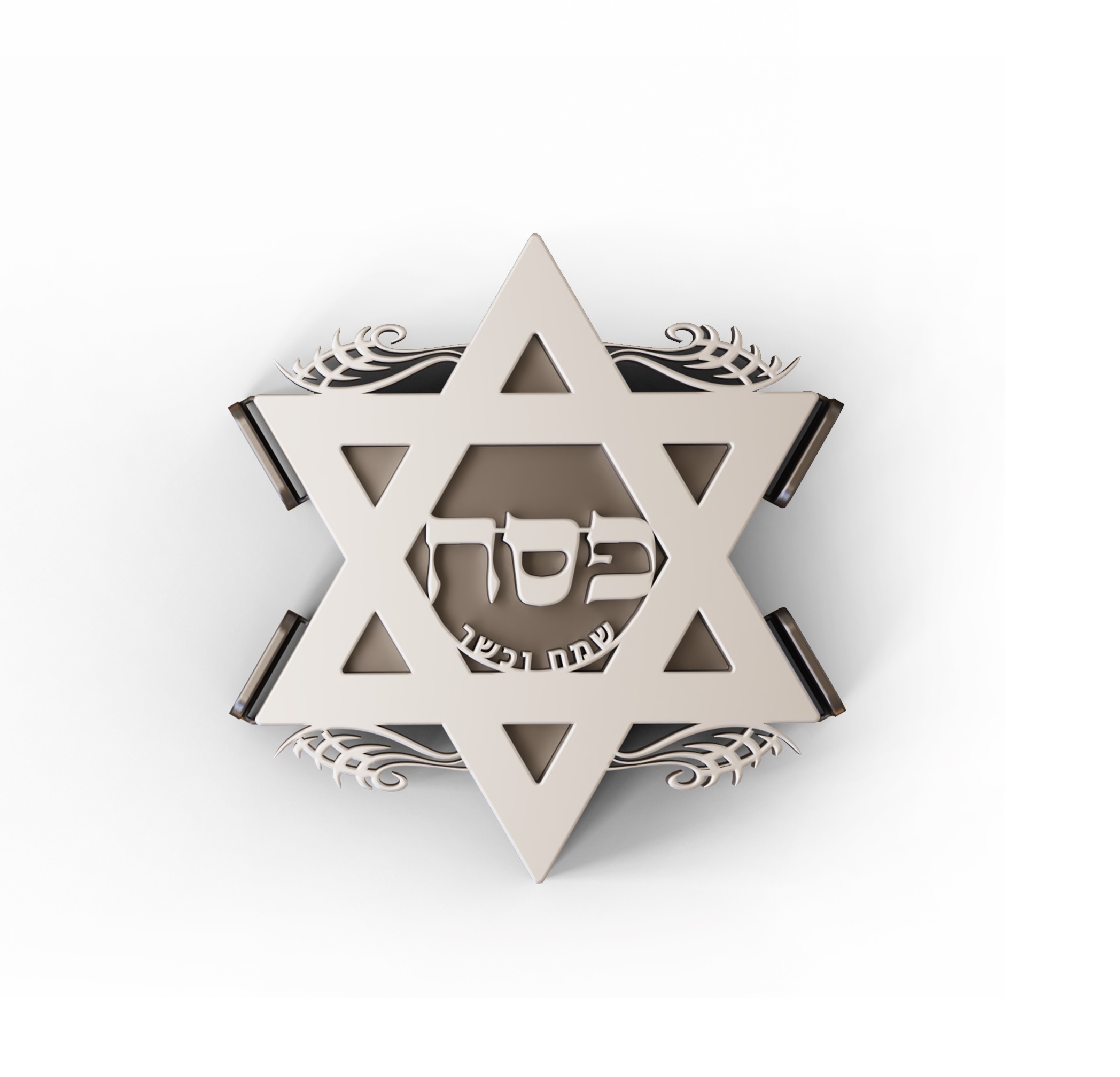 סט תחתיות ממתכת בעיצוב מגן דוד, עם הכיתוב "פסח" במרכז - פתרון מעוצב לשולחן החג. התחתיות משלבות חיתוך לייזר מדויק עם גימור מוקפד, ומתאימות כמתנה עסקית, מזכרת לאירוע או פריט אישי עם משמעות.