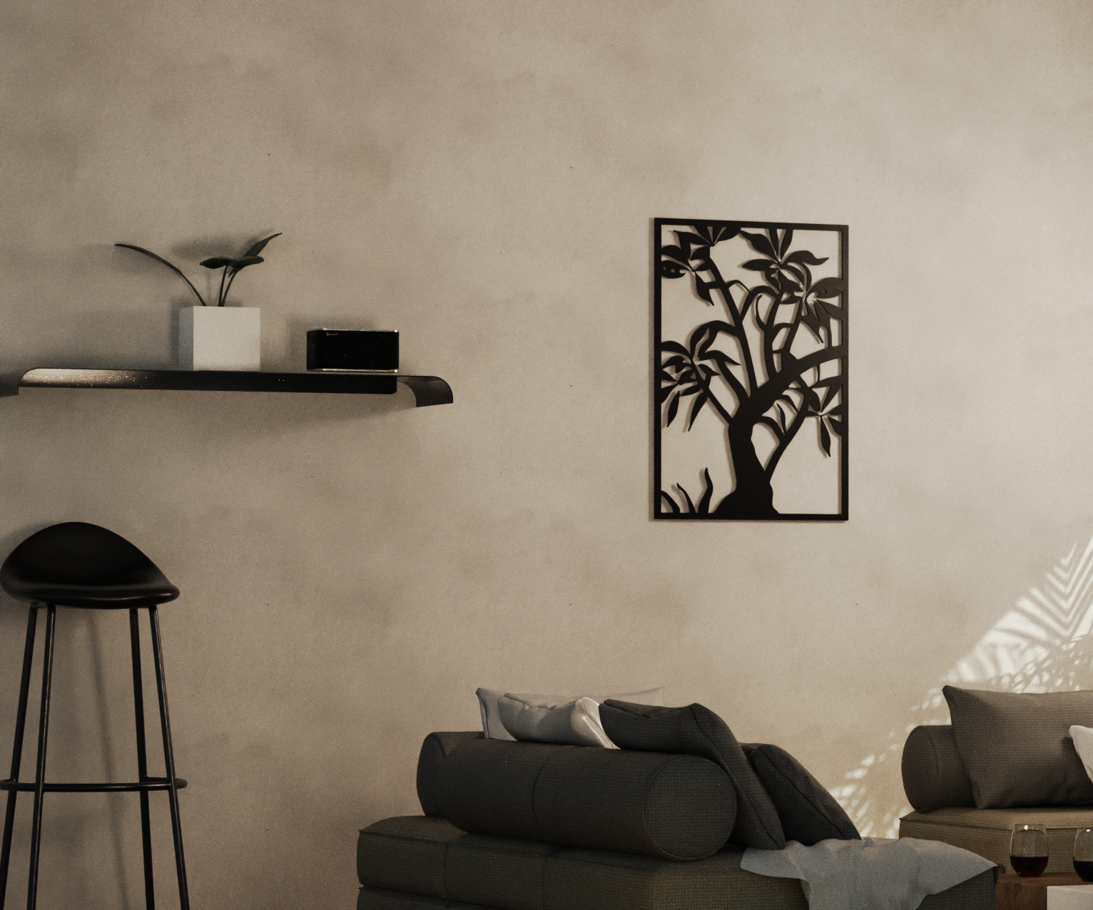 תמונת מתכת דקורטיבית מאלומיניום איכותי קל משקל בחיתוך לייזר מדויק, המציג דגם של עץ מרשים עם עלים. העיצוב הנקי והאלגנטי מתאים לחללים מודרניים וקלאסיים, ומשתלב בסלון, חדר עבודה או מבואה. ניתן לשדרג עם תאורת LED אחורית ליצירת מראה מרשים במיוחד.