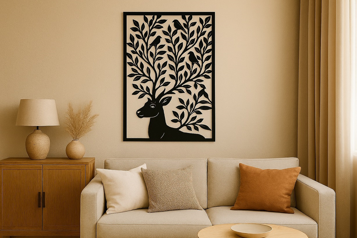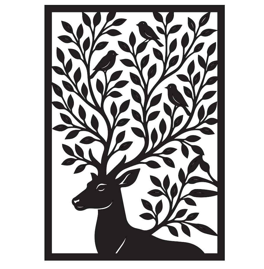 תמונת מתכת מאלומיניום איכותי קל משקל בעיצוב אייל אשר קרניו מתמזגות לענפי עלים עם ציפורים עדינות, בעבודת חיתוך לייזר מדויקת עם פרטים חדים ומוקפדים. הקווים הנקיים והעיצוב המודרני משתלבים בקלות בחללים שונים - סלון, חדר שינה או משרד. ניתן להוסיף תאורת LED אחורית ליצירת עומק ואווירה מיוחדת.