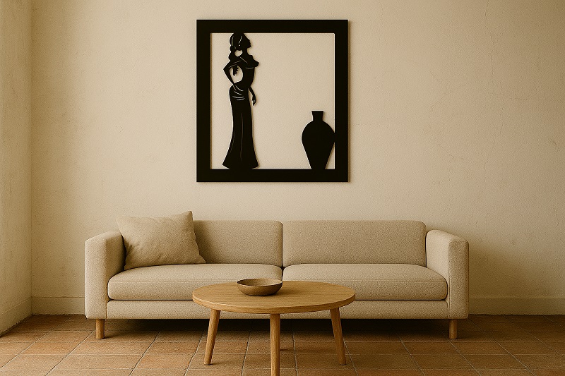 תמונת מתכת מאלומיניום איכותי קל משקל בעיצוב אישה וכד בסגנון אפריקאי, בעבודת חיתוך לייזר מדויקת עם פרטים חדים ומוקפדים. הקווים הנקיים והעיצוב המודרני משתלבים בקלות בחללים שונים - סלון, חדר שינה או משרד. ניתן להוסיף תאורת LED אחורית ליצירת עומק ואווירה מיוחדת.