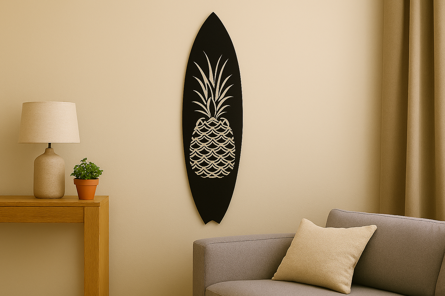 תמונת מתכת מאלומיניום איכותי קל משקל בעיצוב גלשן קיר עם אלמנט אננס, בעבודת חיתוך לייזר מדויקת עם פרטים חדים ומוקפדים. הקווים הנקיים והעיצוב המודרני משתלבים בקלות בחללים שונים - סלון, חדר שינה או משרד. ניתן להוסיף תאורת LED אחורית ליצירת עומק ואווירה מיוחדת.