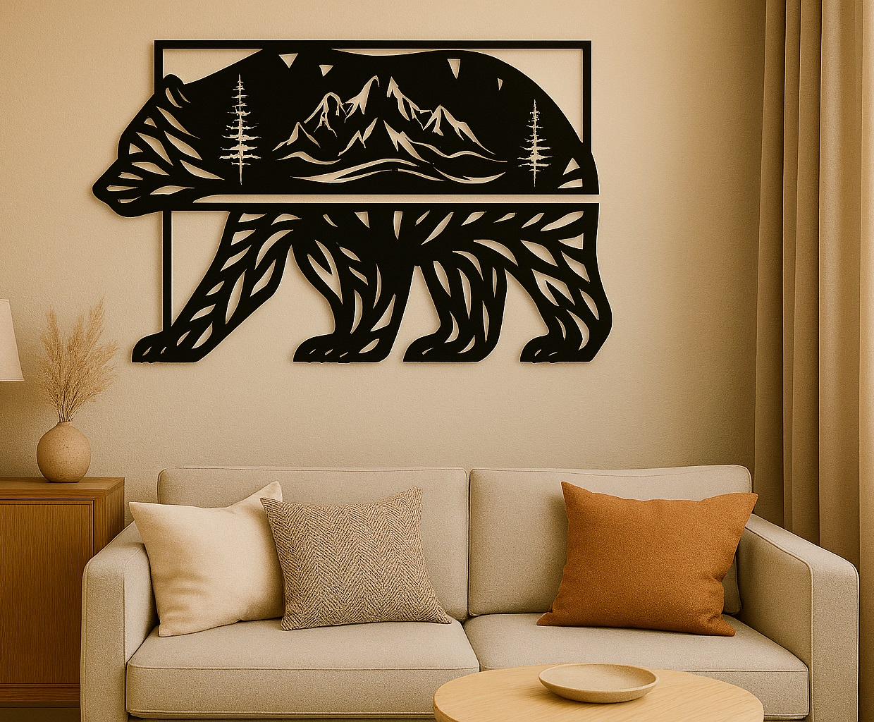 תמונת מתכת מאלומיניום איכותי קל משקל בעיצוב דוב מרשים יוצא ממסגרת וברקע הרים ויערות, בעבודת חיתוך לייזר מדויקת עם פרטים חדים ומוקפדים. הקווים הנקיים והעיצוב המודרני משתלבים בקלות בחללים שונים - סלון, חדר שינה או משרד. ניתן להוסיף תאורת LED אחורית ליצירת עומק ואווירה מיוחדת.