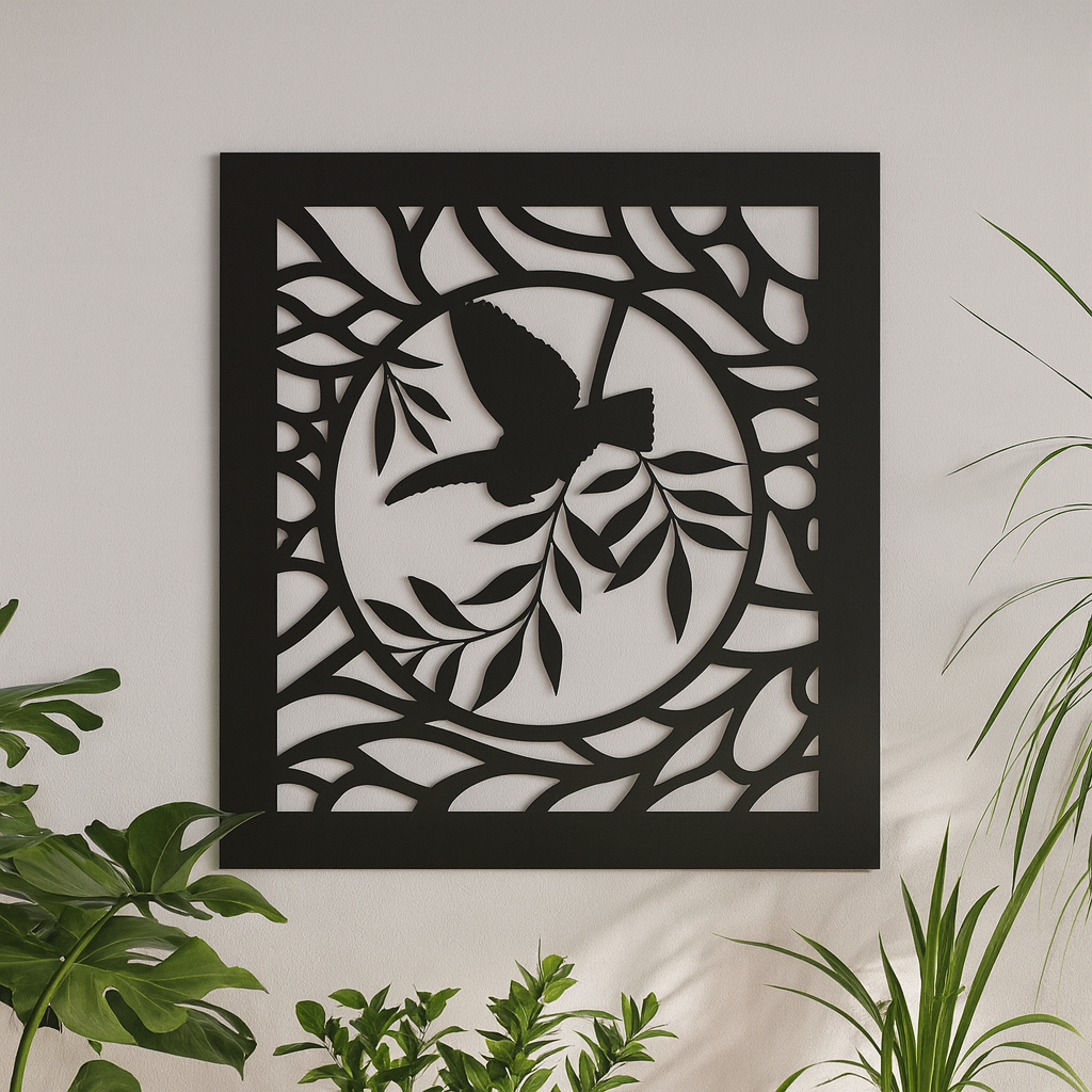 תמונת מתכת מאלומיניום איכותי קל משקל בעיצוב יונה עם עלה של זית, בעבודת חיתוך לייזר מדויקת עם פרטים חדים ומוקפדים. הקווים הנקיים והעיצוב המודרני משתלבים בקלות בחללים שונים - סלון, חדר שינה או משרד. ניתן להוסיף תאורת LED אחורית ליצירת עומק ואווירה מיוחדת.