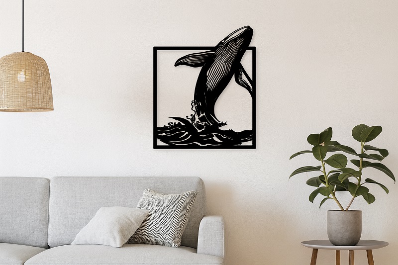 תמונת מתכת מאלומיניום איכותי קל משקל בעיצוב ליוויתן מזנק מחוץ למסגרת, בעבודת חיתוך לייזר מדויקת עם פרטים חדים ומוקפדים. הקווים הנקיים והעיצוב המודרני משתלבים בקלות בחללים שונים - סלון, חדר שינה או משרד. ניתן להוסיף תאורת LED אחורית ליצירת עומק ואווירה מיוחדת.