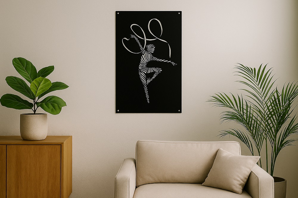 תמונת מתכת מאלומיניום איכותי קל משקל עם חיתוכי לייזר היוצרים דמות נשית בריקוד מחול, בעבודת חיתוך לייזר מדויקת עם פרטים חדים ומוקפדים. הקווים הנקיים והעיצוב המודרני משתלבים בקלות בחללים שונים - סלון, חדר שינה או משרד. ניתן להוסיף תאורת LED אחורית ליצירת עומק ואווירה מיוחדת.