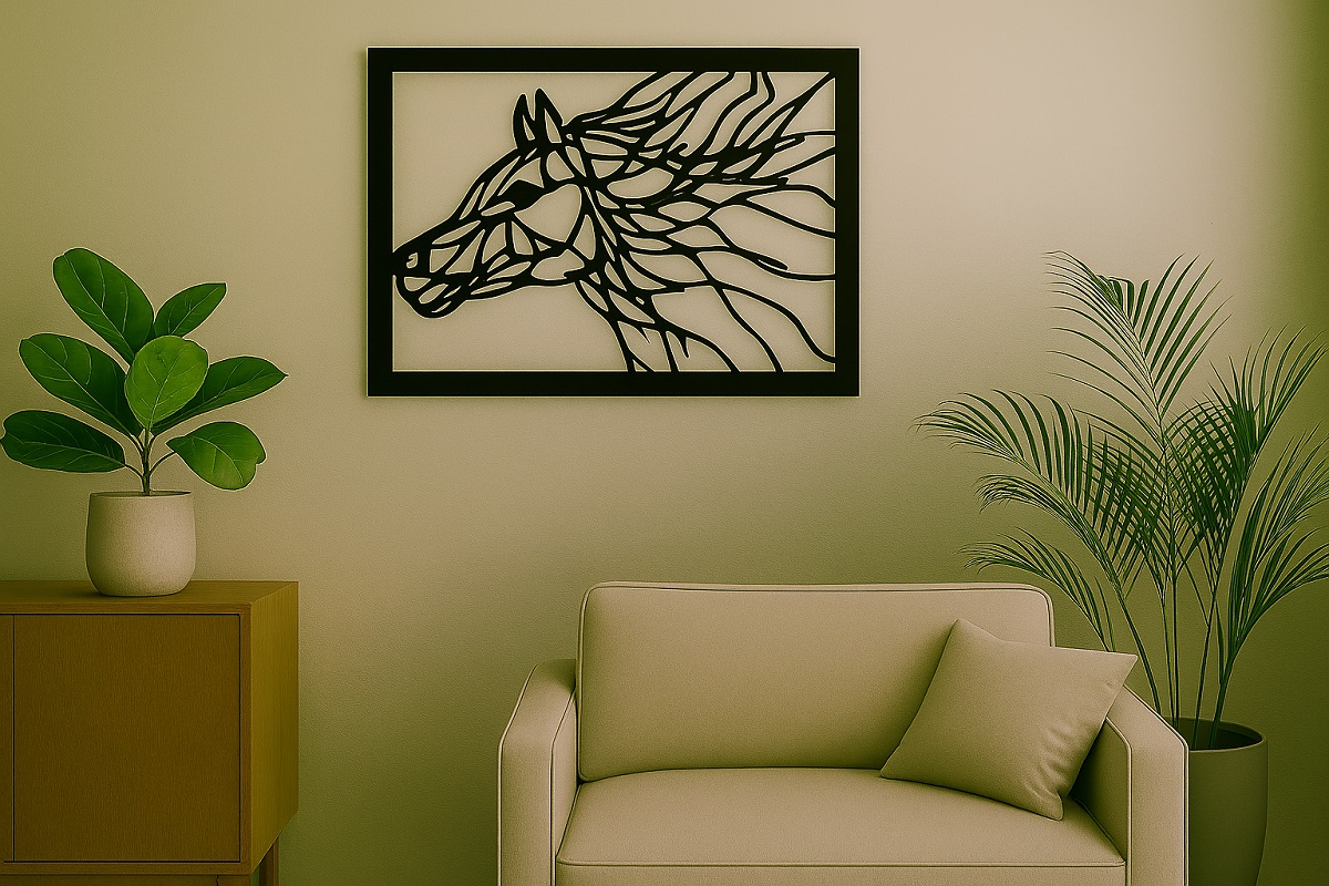 תמונת מתכת מאלומיניום איכותי קל משקל בעיצוב עוצמתי של ראש סוס מקווים גיאומטריים המשדרים עוצמה ותנועה, בעבודת חיתוך לייזר מדויקת עם פרטים חדים ומוקפדים. הקווים הנקיים והעיצוב המודרני משתלבים בקלות בחללים שונים - סלון, חדר שינה או משרד. ניתן להוסיף תאורת LED אחורית ליצירת עומק ואווירה מיוחדת.
