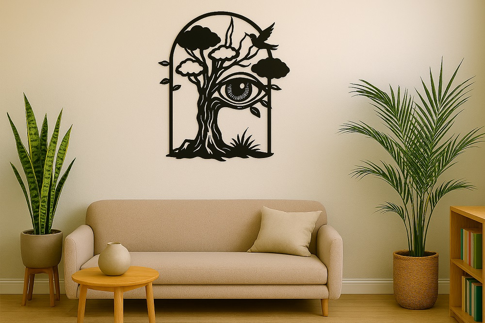 תמונת מתכת מאלומיניום איכותי קל משקל בעיצוב עץ החיים עם עין רואה, עיצוב ייחודי המשדר חכמה וחיבור לטבע. בעבודת חיתוך לייזר מדויקת עם פרטים חדים ומוקפדים. הקווים הנקיים והעיצוב המודרני משתלבים בקלות בחללים שונים - סלון, חדר שינה או משרד. ניתן להוסיף תאורת LED אחורית ליצירת עומק ואווירה מיוחדת.