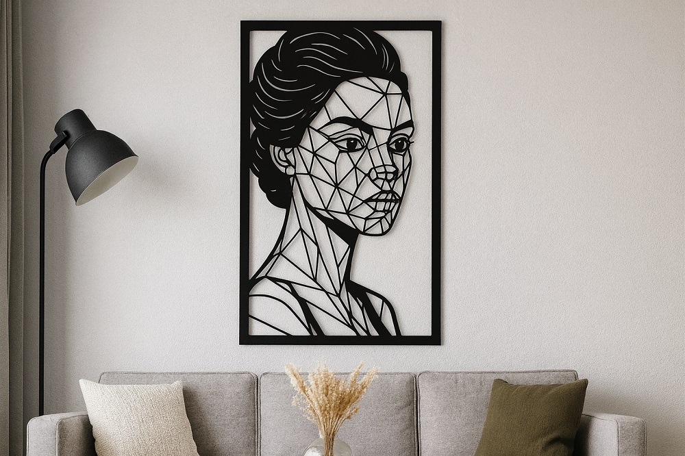 תמונת מתכת מאלומיניום איכותי קל משקל של דמות נשית בקווים גיאומטריים עוצמתיים, בעבודת חיתוך לייזר מדויקת עם פרטים חדים ומוקפדים. הקווים הנקיים והעיצוב המודרני משתלבים בקלות בחללים שונים - סלון, חדר שינה או משרד. ניתן להוסיף תאורת LED אחורית ליצירת עומק ואווירה מיוחדת.