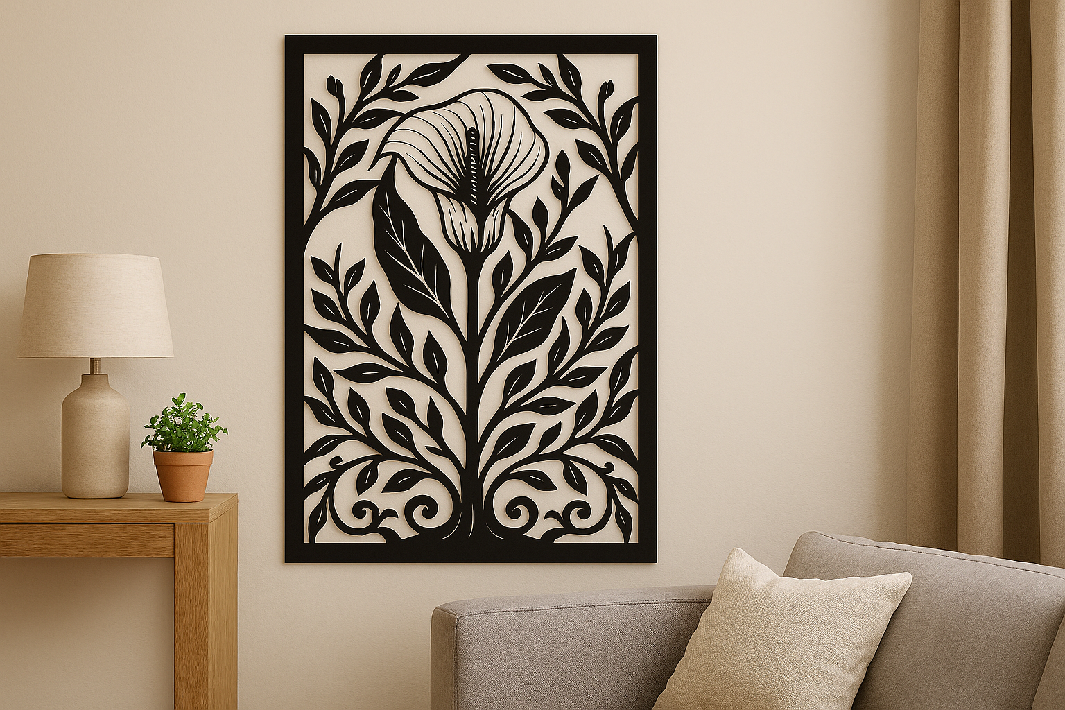 פריט עיצוב ייחודי מאלומיניום איכותי קל משקל בחיתוך לייזר מדויק, המציג דגם מרגיע של פרח הקאלה. העיצוב הנקי והאלגנטי מתאים לחללים מודרניים וקלאסיים, ומשתלב בסלון, חדר עבודה או מבואה. ניתן לשדרג עם תאורת LED אחורית ליצירת מראה מרשים במיוחד.