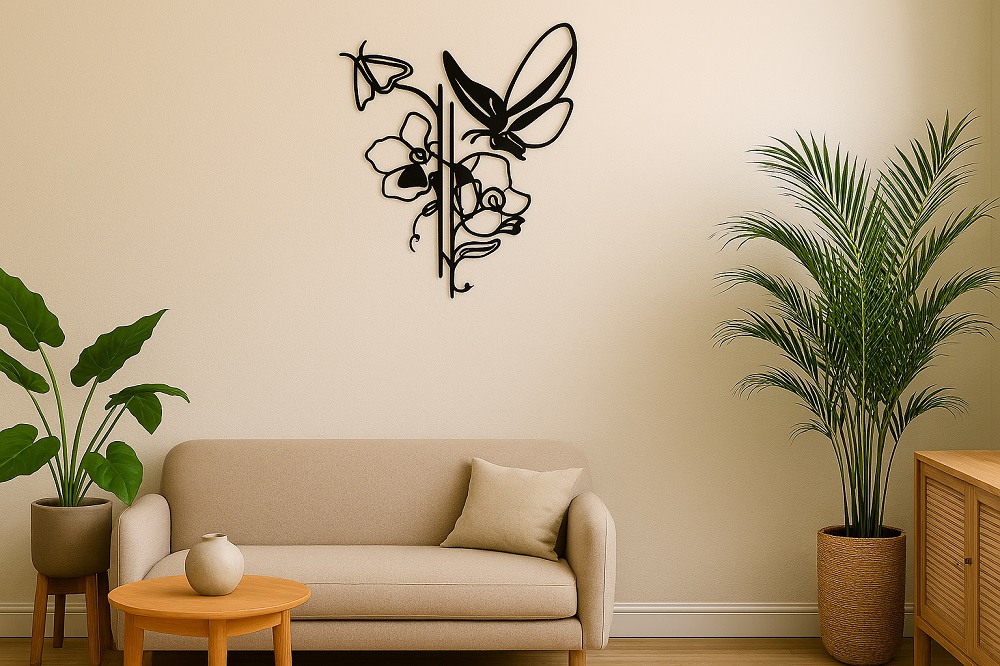 תמונת מתכת מאלומיניום איכותי קל משקל של פרפרים על פרחים אקזוטיים, בעבודת חיתוך לייזר מדויקת עם פרטים חדים ומוקפדים. הקווים הנקיים והעיצוב המודרני משתלבים בקלות בחללים שונים - סלון, חדר שינה או משרד. ניתן להוסיף תאורת LED אחורית ליצירת עומק ואווירה מיוחדת.