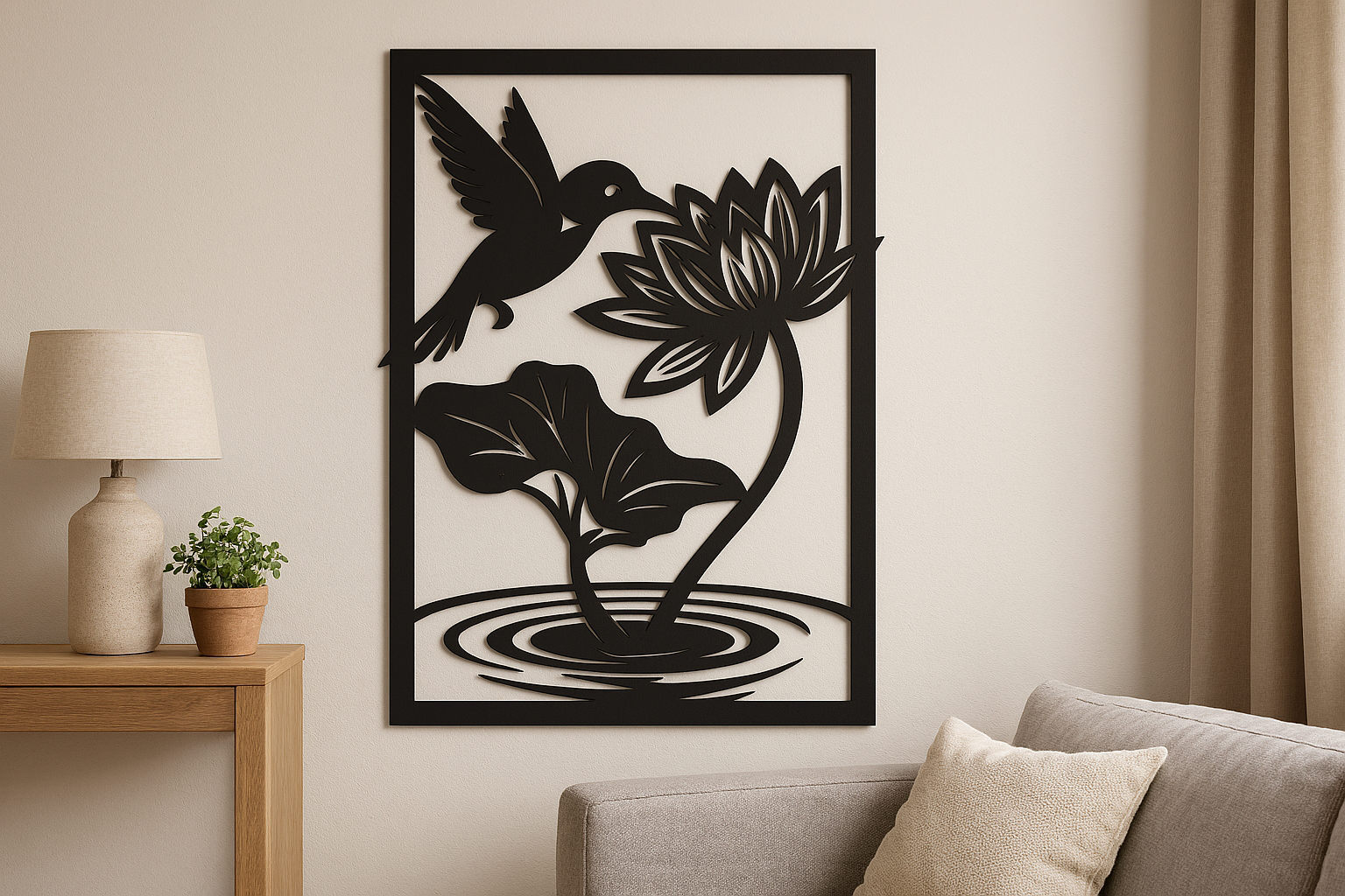 תמונת מתכת מאלומיניום איכותי קל משקל בעיצוב ציפור יונק הדבש על פרח לוטוס מרשים, בעבודת חיתוך לייזר מדויקת עם פרטים חדים ומוקפדים. הקווים הנקיים והעיצוב המודרני משתלבים בקלות בחללים שונים - סלון, חדר שינה או משרד. ניתן להוסיף תאורת LED אחורית ליצירת עומק ואווירה מיוחדת.