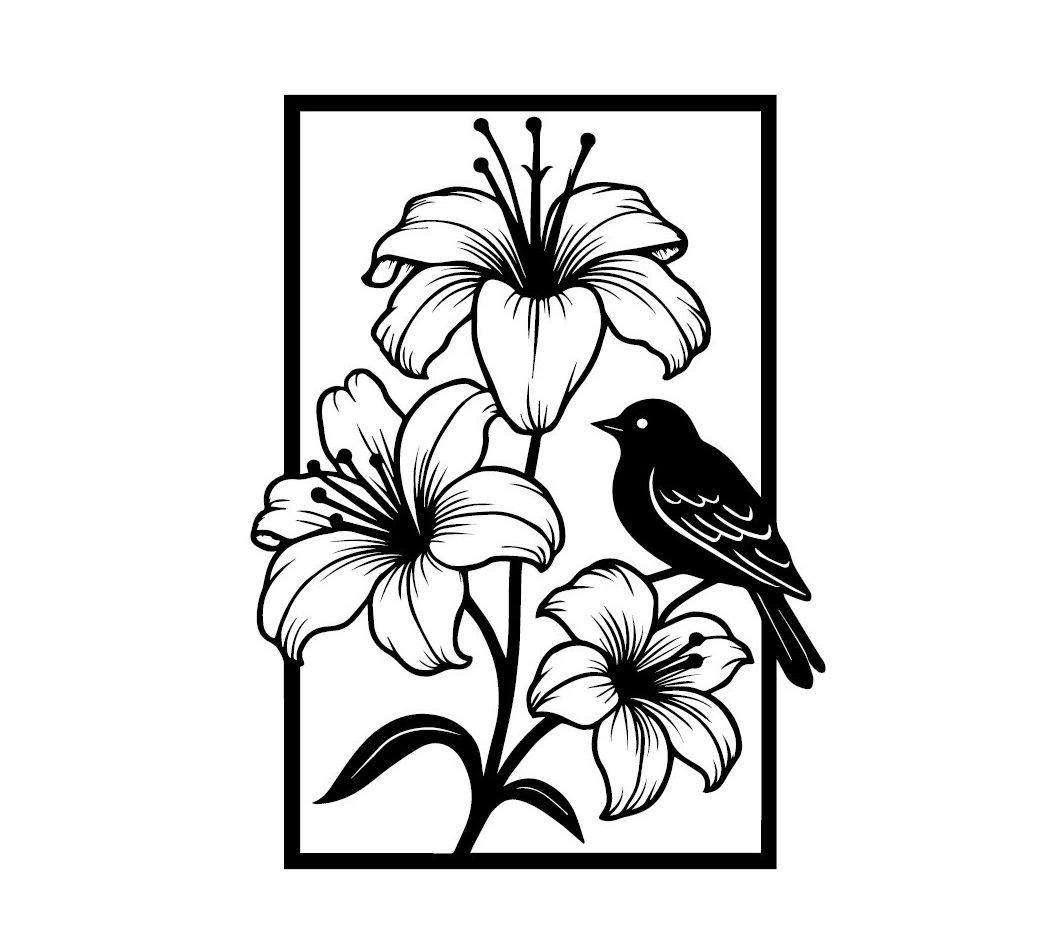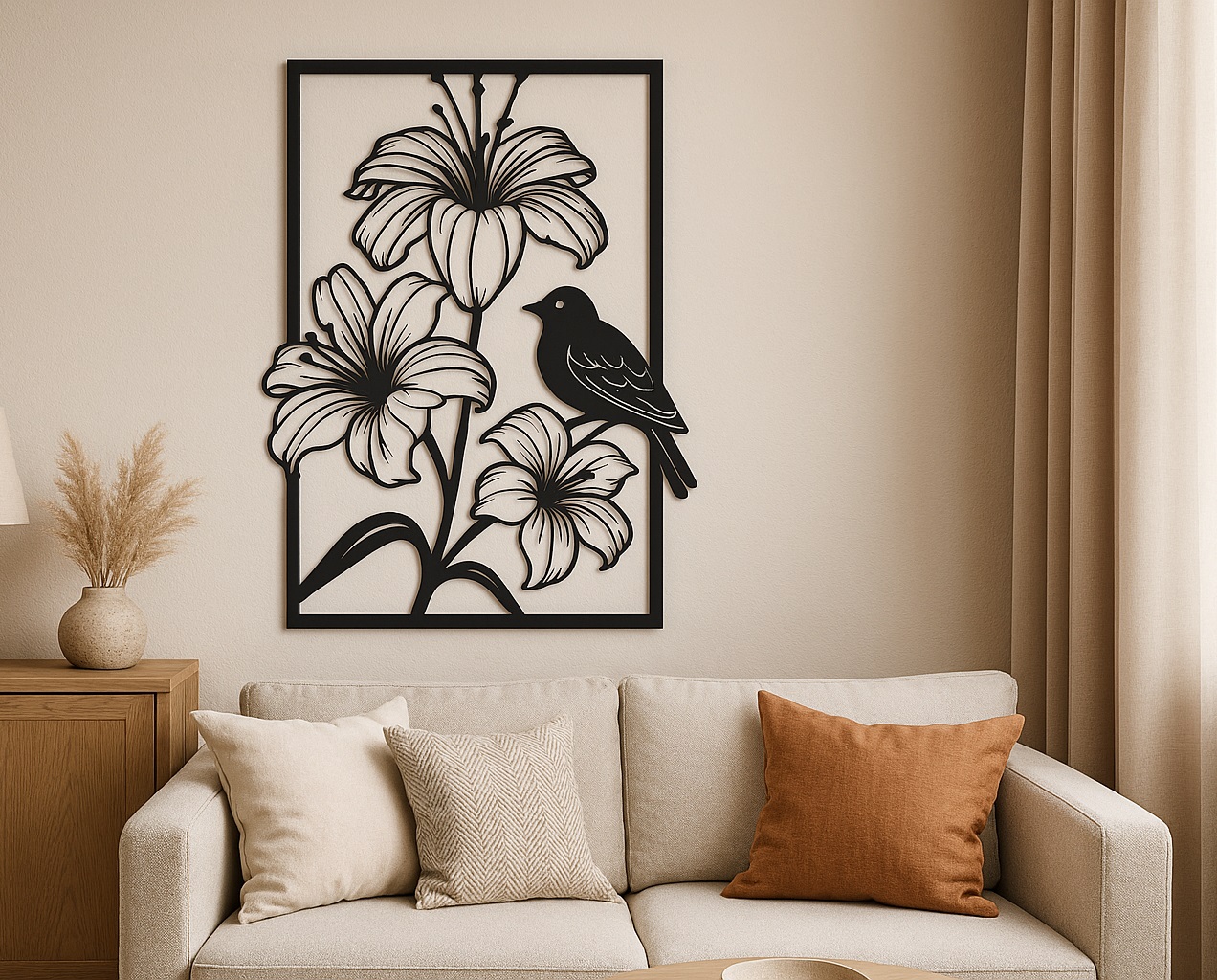 תמונת מתכת מאלומיניום איכותי קל משקל בעיצוב ציפור יונק הדבש על פרח לוטוס מרשים, בעבודת חיתוך לייזר מדויקת עם פרטים חדים ומוקפדים. הקווים הנקיים והעיצוב המודרני משתלבים בקלות בחללים שונים - סלון, חדר שינה או משרד. ניתן להוסיף תאורת LED אחורית ליצירת עומק ואווירה מיוחדת.