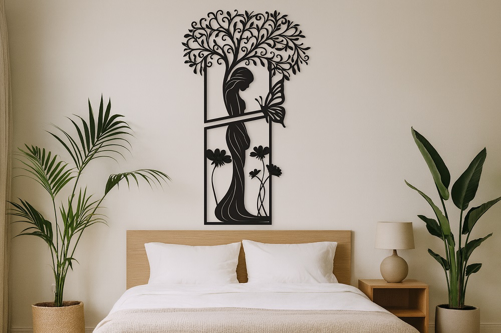תמונת מתכת מאלומיניום איכותי קל משקל בעיצוב המשלב קווים אלגנטיים ודמות נשית מחוברת לעץ ולטבע. בעבודת חיתוך לייזר מדויקת עם פרטים חדים ומוקפדים. הקווים הנקיים והעיצוב המודרני משתלבים בקלות בחללים שונים - סלון, חדר שינה או משרד. ניתן להוסיף תאורת LED אחורית ליצירת עומק ואווירה מיוחדת.